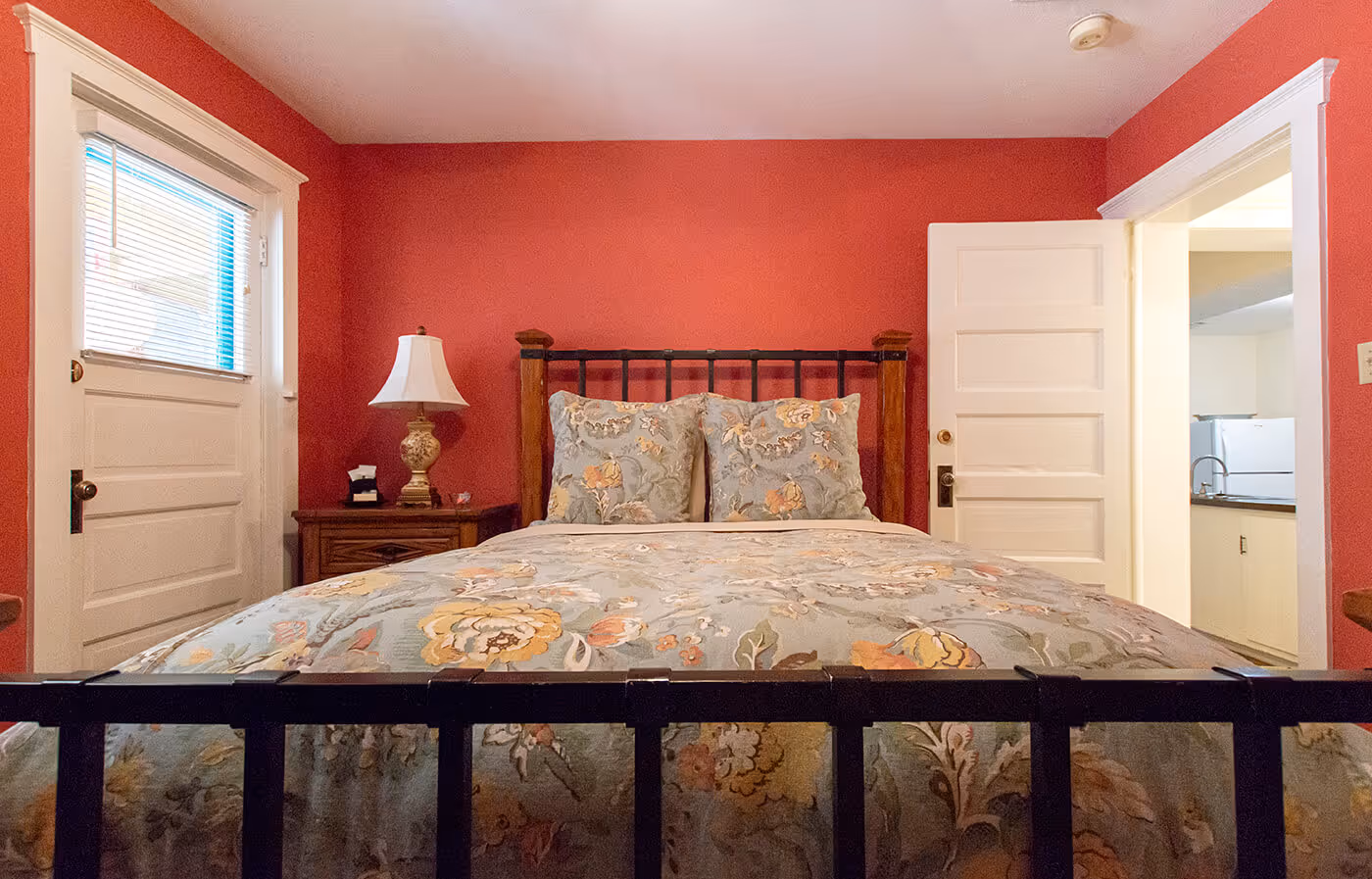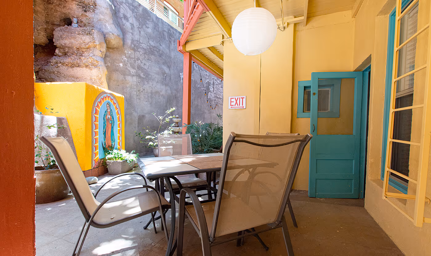 This secluded ground floor suite provides easy entry as well as private access to the rear courtyard. The spacious suite offers a comfortable living room, fully equipped dine-in kitchen, private bath, and two bedrooms; each featuring a queen size bed. Both bedrooms are located in the rear of the suite, providing a quieter nights sleep. Our vibrant, Lady of Guadalupe mural on the back patio keeps watch over Suite 3.