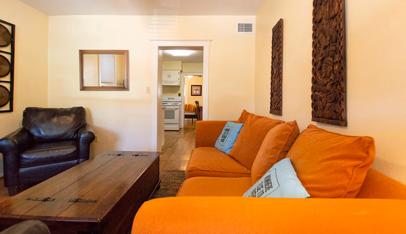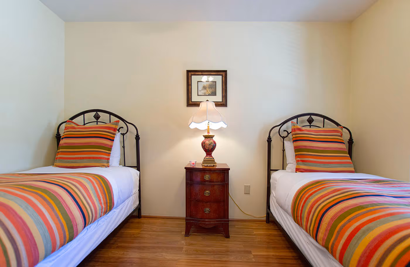 This secluded ground floor corner suite provides easy entry from a private front veranda as well as private access to the rear courtyard and a quiet patio area. This is a two-bedroom suite featuring a queen size bed in the rear bedroom and (2) twin beds in the front bedroom. The bedrooms are nicely separated from each other providing lots of privacy for sharing with another couple or children. The spacious suite has wood floors throughout, features a comfortable living room, fully equipped dine-in kitchen, and a private bath with a vintage claw foot bathtub & shower enclosure.