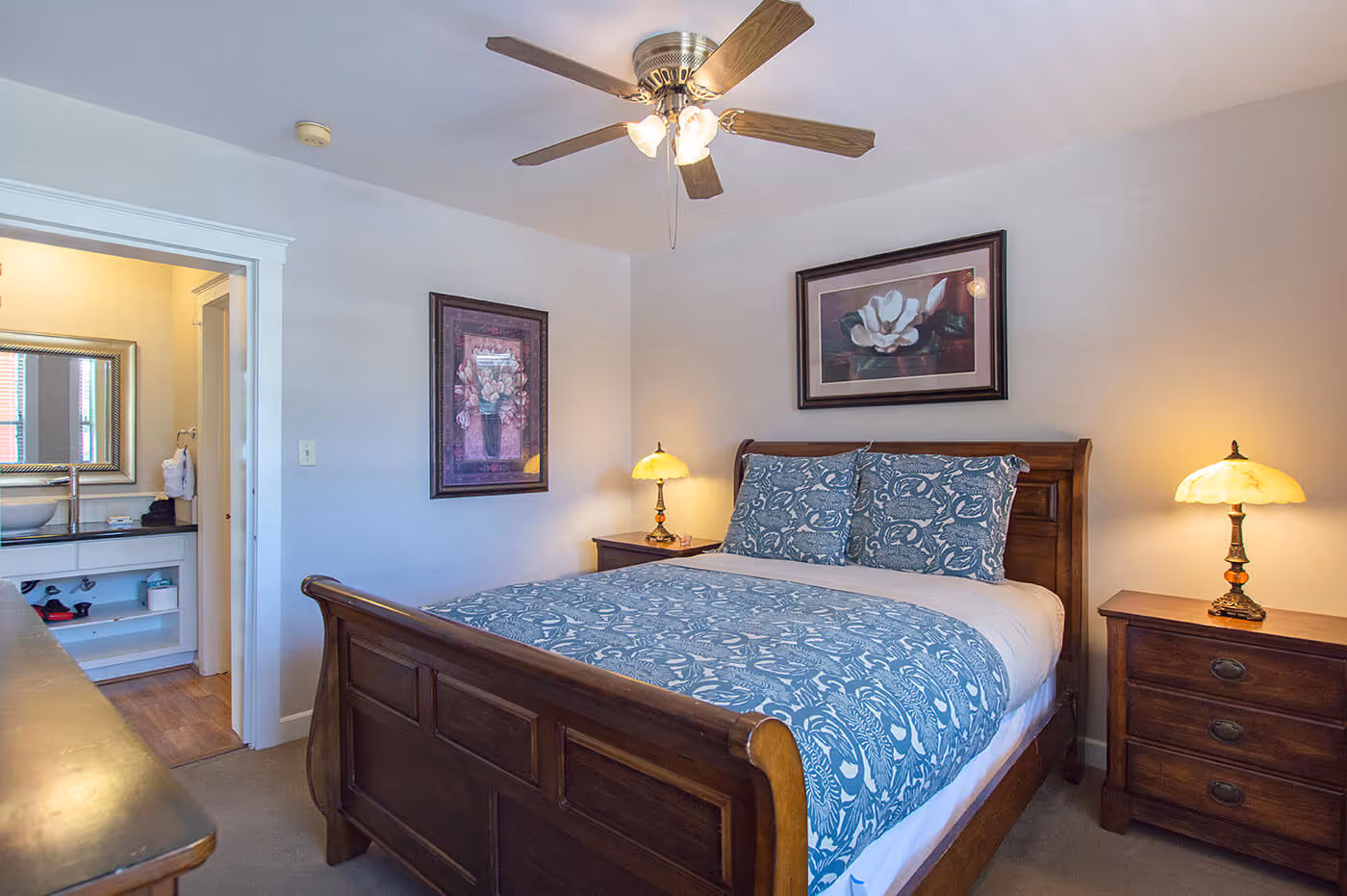 This bright and airy corner suite is located on the 2nd floor. The spacious 850 sq. ft. suite features a comfortable living room, fully equipped dine-in kitchen, private bath with original clawfoot bathtub & shower, and two separate bedrooms. The bedrooms are located at opposite ends of the suite offering the greatest amount of privacy when sharing with another couple or family. The front bedroom features a queen size bed and the back bedroom features a beautiful four poster king. Enjoy panoramic views from the living room and large front veranda.